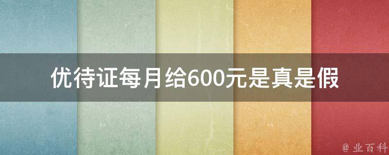 优待证每月给600元是假的。优待证每月有补贴,但补贴并不是全国统一的。部分地区规定,对持有优待证的群体且家庭贫困的每个月可以领取100元的补贴,比如湖北省。除了补贴外,还有以下待遇:把工作成绩与晋级、提升、选模范、评先进联系起来,以形式或名义进行标定,主要为表扬、奖励、经验介绍等;审查购买保障性住房或租住的条件时,抚恤、补助和优待金、护理费不计入个人和家庭收入。