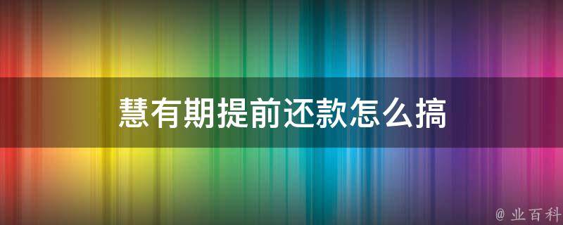 最佳答案1、首先需要登录慧有期借款APP。2、在我的页面中找到还款服务选项,点击进入。3、选择提前还款选项,然后选择需要还款的期数,输入还款金额并确认还款信息。4、确认还款信息无误后,点击确认还款按钮进行还款操作。5、完成还款后,及时联系客服进行确认即可。
