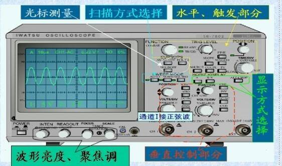 (4)调节垂直旋钮和水平旋钮,使屏幕显示的波形图稳定,并将垂直微调和水平微调置于校准位置;