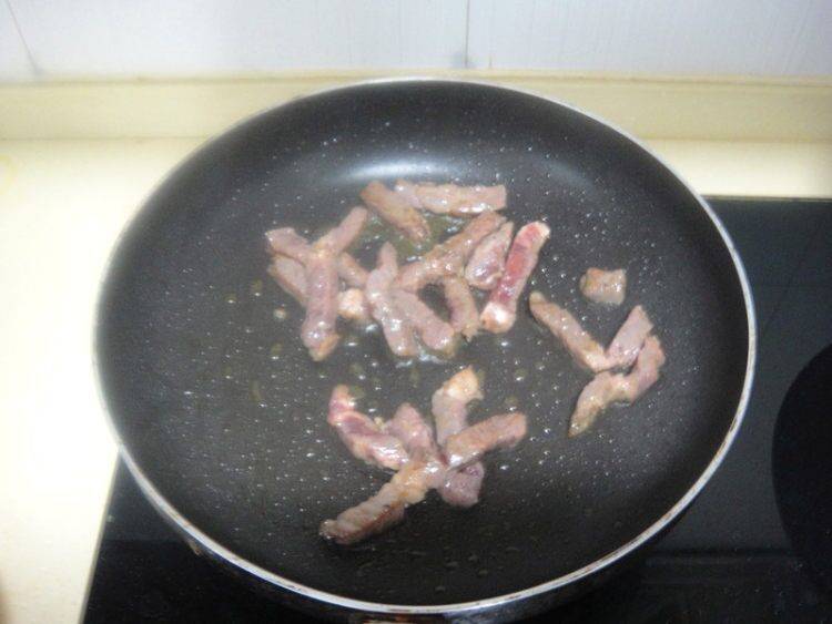 6、温油下入牛柳翻炒至变色。