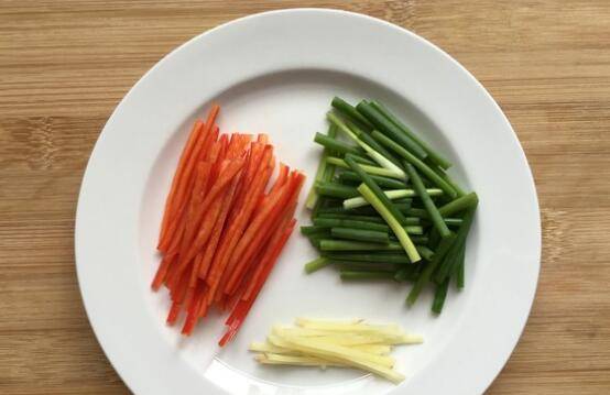2、红椒切丝,香葱切段,姜切丝。