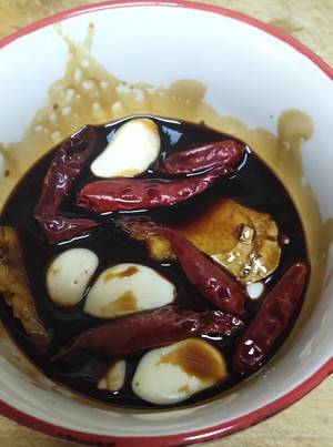 4、准备一个碗,加入生抽、老抽、料酒、蒜、红椒、姜片和糖,搅拌均匀。
