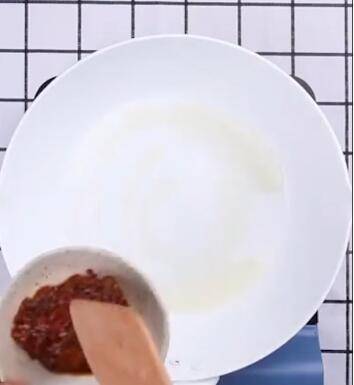 锅内烧油,倒入豆瓣酱、火锅底料、干辣椒、花椒、葱姜蒜,爆香。