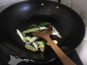 2、小火炒香大葱,八角,桂皮,花椒,生姜。