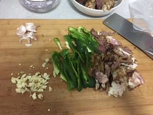 7、卤好的拿出来放凉,选择一块肥瘦相间的切薄片。辣椒,蒜切好。