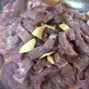 3、猪腰加盐、姜片、料酒、生抽、淀粉,搅拌均匀静置20分钟。