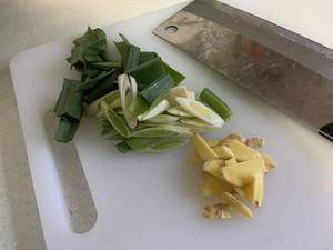 3、蒜苗叶、姜片切好备用。