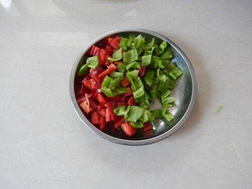 3、红椒、青椒切丁。
