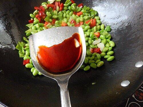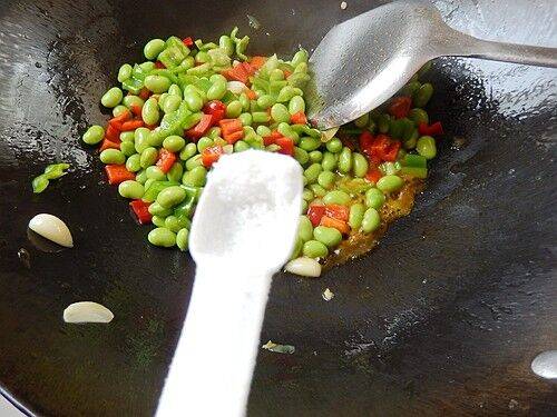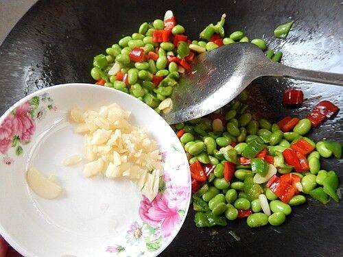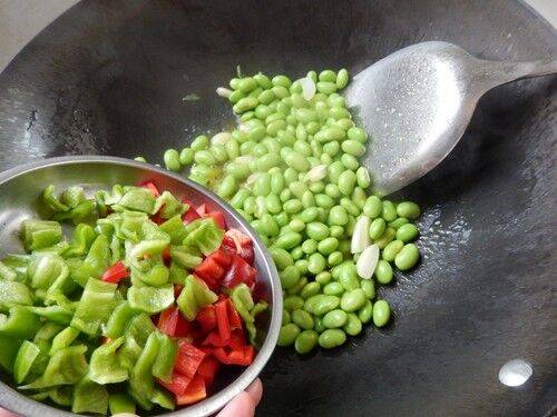 7、加入毛豆仁小炒。