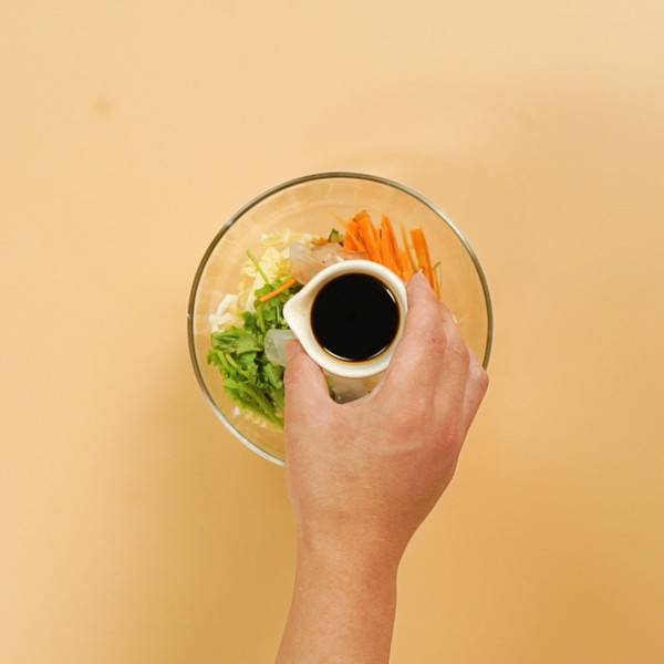 2、香菜切丝,大蒜切末,白菜切丝,胡萝卜切丝,黄瓜切丝。