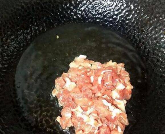 3、另起锅烧油,遵循热锅凉油的做法,放入肉丁煸炒。
