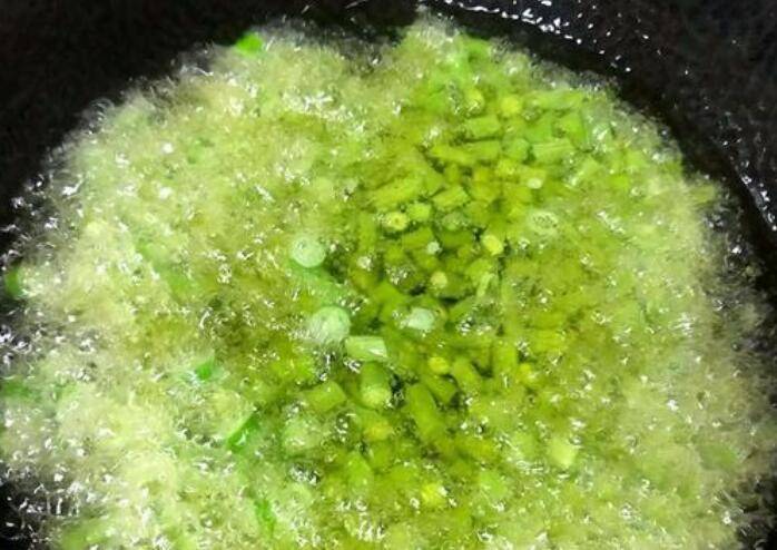 2、锅内放入稍微多一些的油,油温至六成热放入豆角和青椒圈炸至表皮起泡微皱,捞出控油备用。