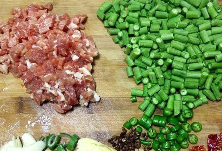材料:猪肉、豆角、葱姜蒜、花椒、青椒、干红辣椒。
