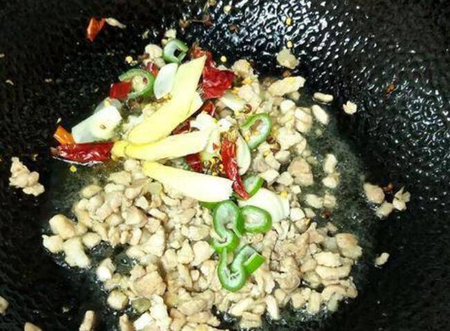 4、炒至肉丁变色,放入葱姜蒜、花椒、干红辣椒炒出香味。