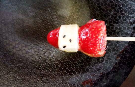 糖葫芦在糖浆中迅速裹一圈,可爱的小雪人糖葫芦就做好了。