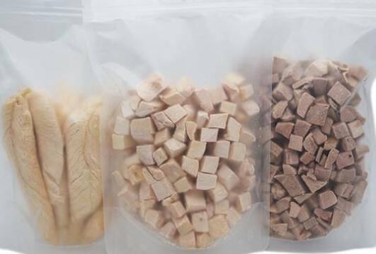 准备食材:鸡胸肉将鸡胸肉洗净沥干水分,再切成2cm的小块把切好鸡肉块放进食品冻干机仓内,关闭设备门,设置肉类冻干工艺等待冻干程序结束,取出用密封性好的罐子储存,或者抽真空保存即可。