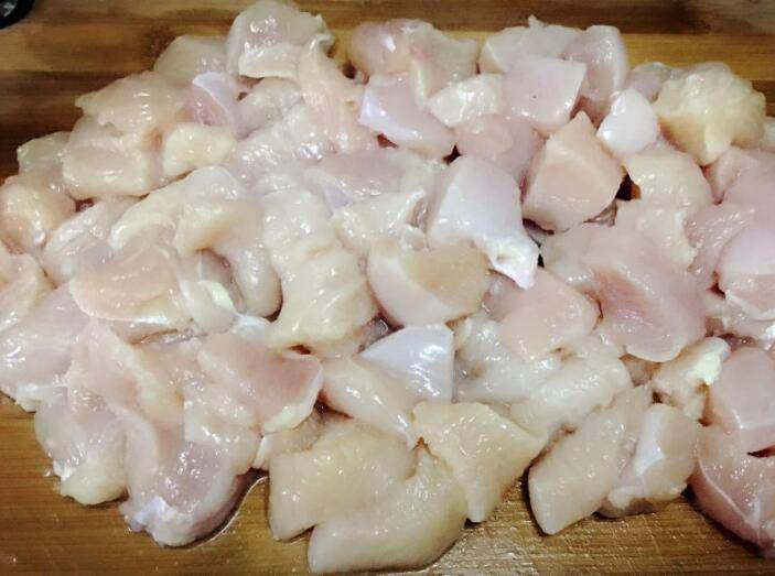 将鸡胸肉洗净沥干水分,再切成2cm的小块