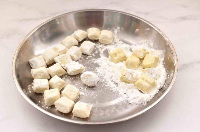 2、把包浆豆腐洗净后沥干水分,每个豆腐块裹上一层薄薄的淀粉。