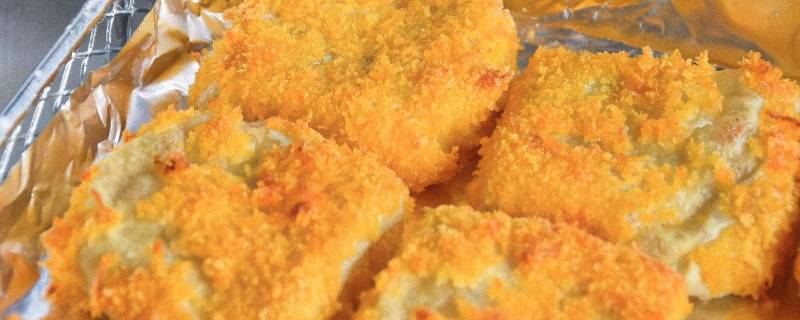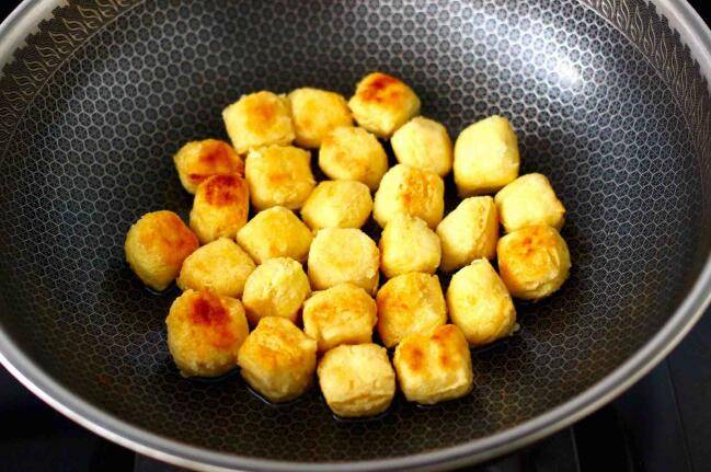 5、锅烧热后倒入花生油烧热,放入包浆豆腐,小火慢煎至两面金黄。
