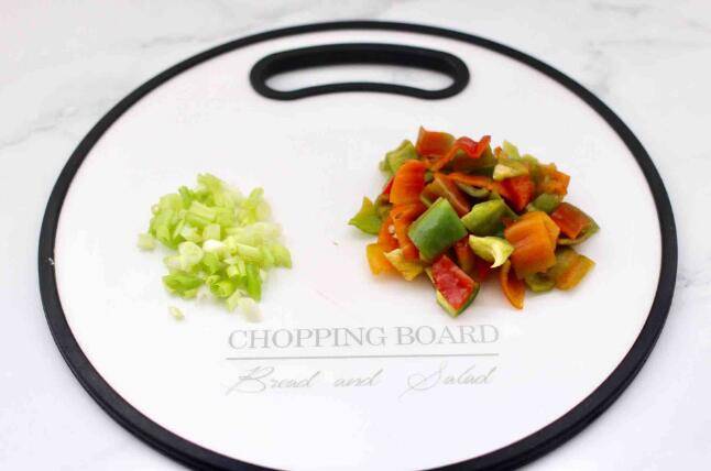 3、小葱切碎,辣椒切成小丁。