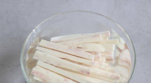 2、切好的山药条放在淡盐水里清洗3遍左右,尽量把表面的黏液洗干净。