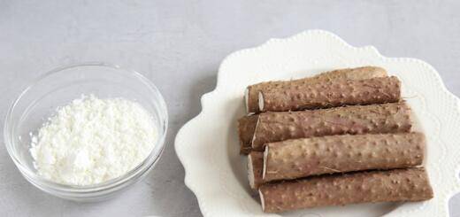 1、将山药去皮切成长条,因为山药的黏液直接沾手上会引起过敏发痒,所以处理的时候要戴上手套。