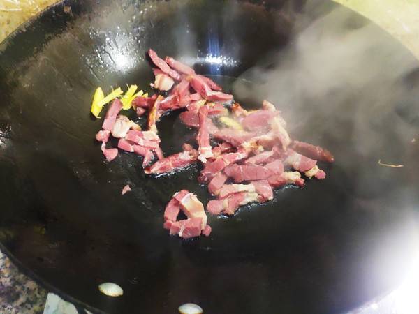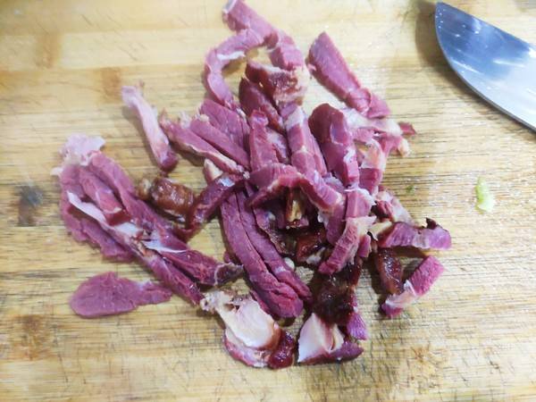 用料:熏马肉150克、茶干50克、青椒半个、盐1克、料酒5克、蚝油5克、油适量、姜丝2克。