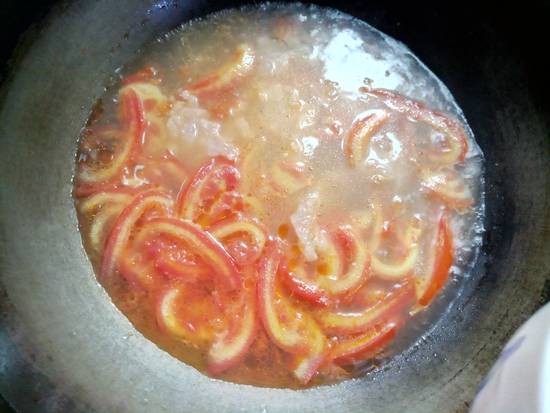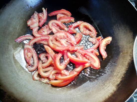 3、锅烧热,倒入适量油,倒入番茄先煸炒一下。