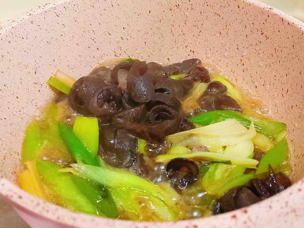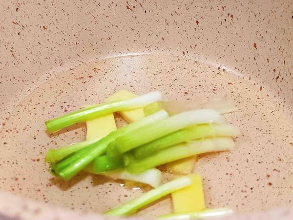 5、放入海参和大葱翻炒,再加入高汤、生抽、料酒、盐、鸡精,焖煮片刻。
