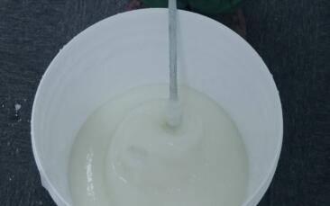 使用电动搅拌棒对桶内未加水的糯米胶进行第一次搅拌;