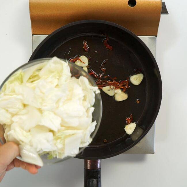 1、准备食材:白菜240克、葱花5克、蒜片5克、食用油5毫升、干辣椒3克、白砂糖10克、醋10克、生抽5克。
