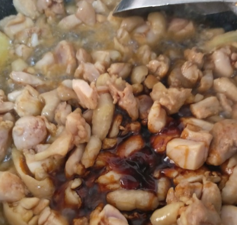 放入鸡肉煸炒5分钟,放盐、糖、蚝油和老抽调味;
