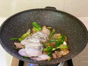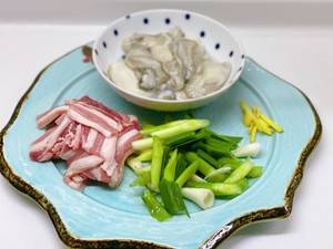 用料:五花肉、生蚝、蒜苗、盐、生抽、姜丝、蒜苗。
