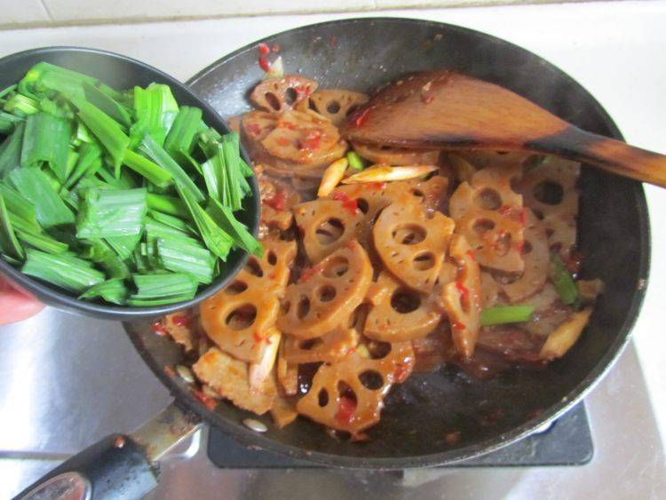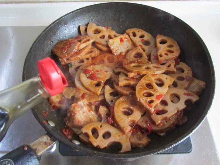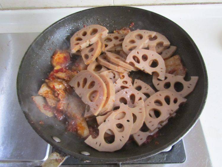 9、放入藕片一起翻炒。