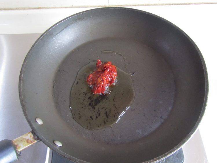 7、烧热锅,放少许油,下入豆瓣酱煸炒。