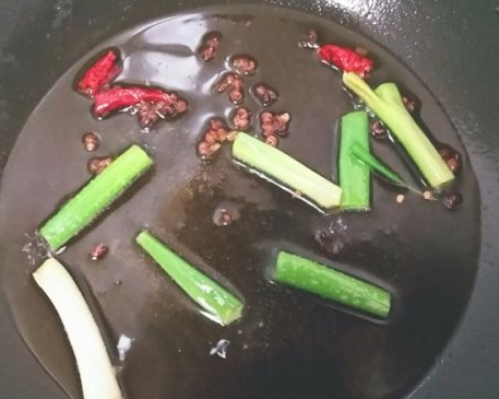 锅中倒入适量的油,加入花椒、红辣椒段和葱段煸出香味,再倒入酸菜大火爆炒两分钟;