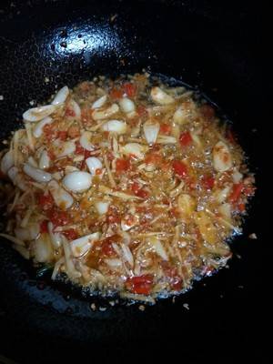 3、热锅冷油烧半分钟放入剁辣椒、姜、大蒜炸香,酥出红油。