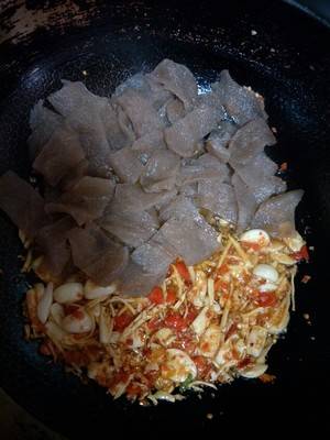 7、牛肉和魔芋炒匀,加入山胡椒油。