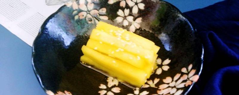 寿司里的黄萝卜叫日式腌制酱萝卜。日式腌制酱萝卜有浅黄色,也有酱黄色,日本各个地区的日式腌制酱萝卜种类不同。日式腌制酱萝卜本来是应该用味增腌制的“浅酱黄色”,但也有很多地方用可食用人工色素代替。