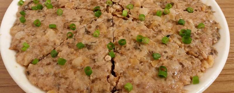 五花肉搞成肉碎。咸鱼切成粒。热锅少油放葱,咸鱼粒微炒。将肉饼、生粉、炒好的咸鱼粒、胡椒粉拌匀;隔水蒸熟。撤上葱花,搞定。