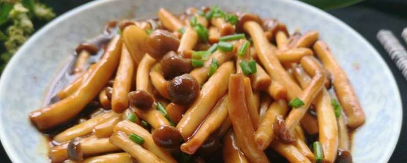 用料:蟹味菇300克、猪肉100克、淀粉4克、料酒3克、葱少许、食用油适量、酱油、盐。