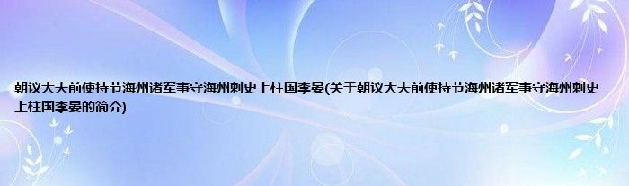 大家好,朝议大夫前使持节海州诸军事守海州刺史上柱国李晏,关于朝议大夫前使持节海州诸军事守海州刺史上柱国李晏的简介很多人还不知道,现在让我们一起来看看吧!