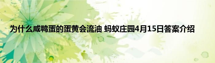 蚂蚁庄园很多玩家都在上面养鸡,如果你想要让自己的鸡长得更好的话,可以通过每天的小课堂的玩法来猎取到一定的饲料的,其中4月15日的题目已经给玩家带来更新,今天的题目是为什么咸鸭蛋的蛋黄会流油?对于这道题目很多玩家不知道正确的答案是什么了,那下面就让小编给大家介绍一下。