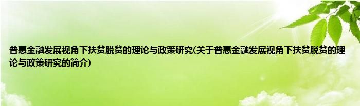 普惠金融发展视角下扶贫脱贫的理论与政策研究(关于普惠金融发展视角下扶贫脱贫的理论与政策研究的简介)